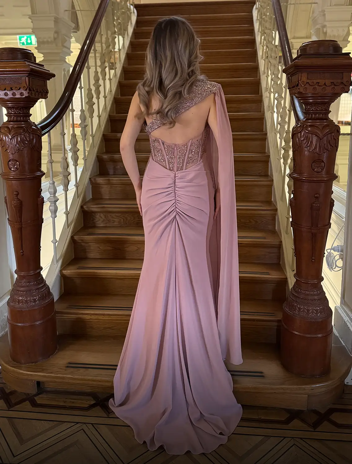 De Alice Dress heeft een one-shoulder ontwerp met een vloeiende, cape-achtige mouw. Hij heeft een aansluitend lijfje met een hoge halslijn en is versierd met decoratieve details. De rok heeft een vloeiend, lang silhouet en een flinke split aan de zijkant, die loopt van het dijbeen tot aan de knie. Delicate versieringen zijn aanwezig langs de halslijn, zoom en zijnaad.