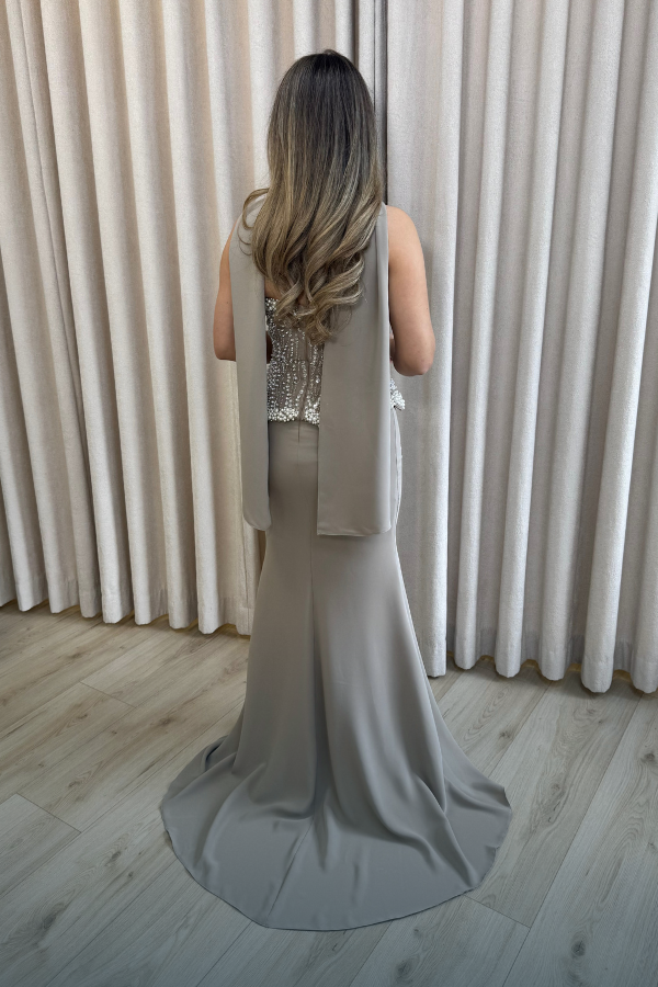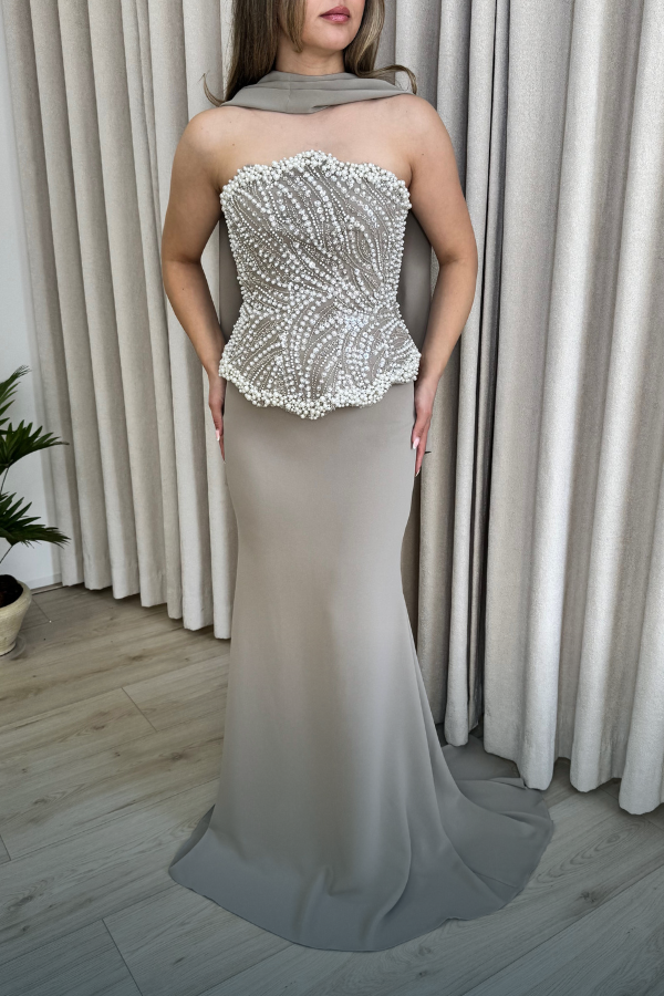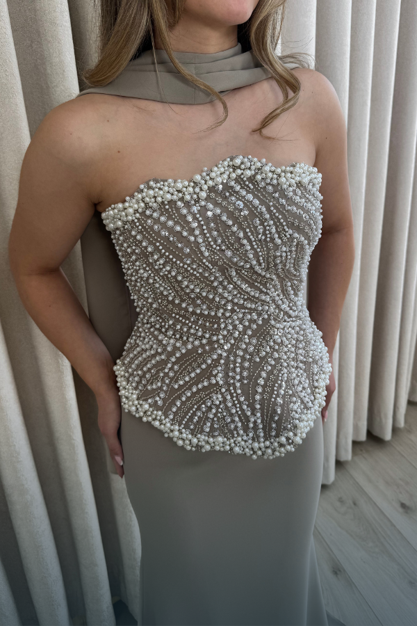 Felicia Dress is een elegante, strapless avondjurk in beige. Het bovenstuk is rijkelijk versierd met parels en kralen in een golvend patroon dat het figuur accentueert. De taille is nauwsluitend en loopt uit in een gladde, vloeiende jurk die tot op de grond reikt. Een subtiele sjaaldetail rond de hals voegt een verfijnde en moderne touch toe aan het geheel.