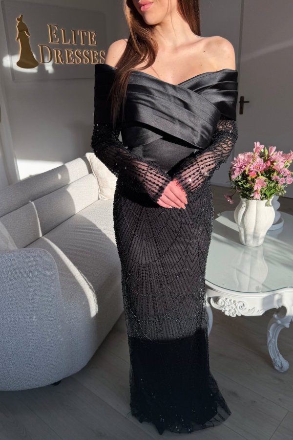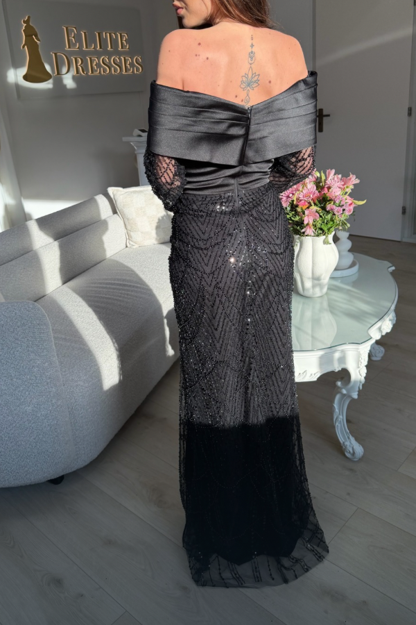 Hazal Dress is Elegante, zwarte off-shoulder avondjurk met een satijnen overslagcorsage en verfijnde, transparante mouwen met kralen. Aansluitende pasvorm en vloerlange jurk voor een tijdloze, chique uitstralin perfect voor gala’s en formele gelegenheden.