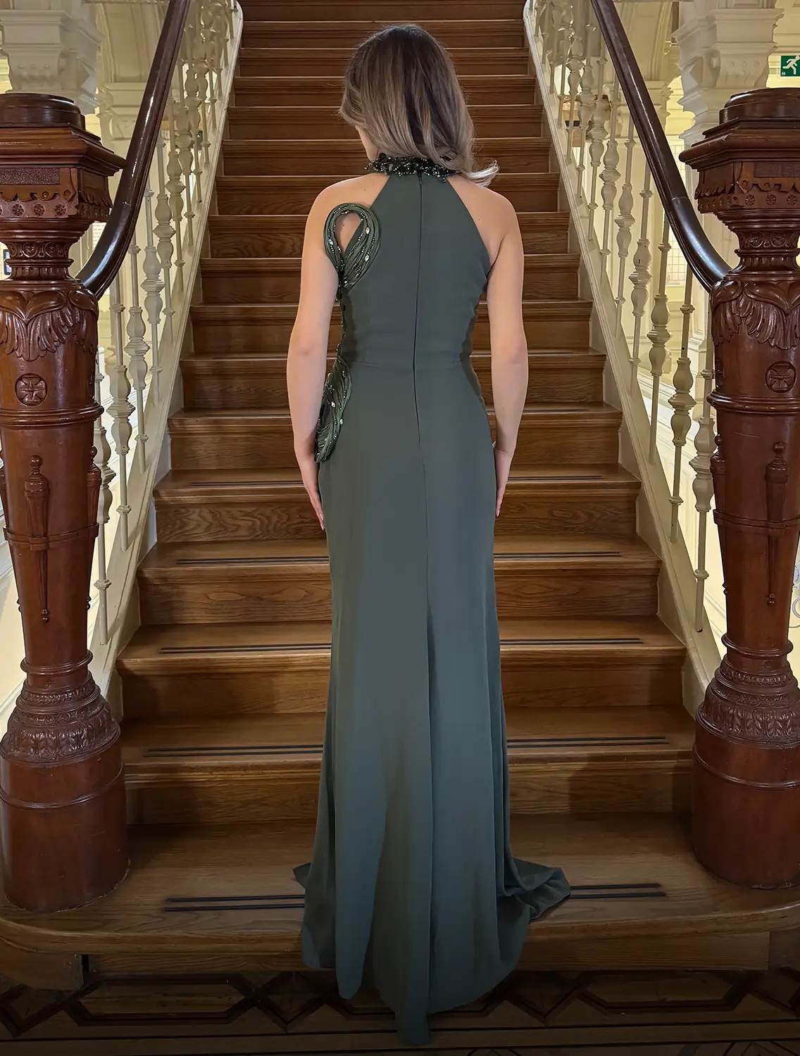 Deze elegante maxi-jurk met halternek heeft een uniek gedrapeerd lijfje met prachtige versieringen. Het vloeiende silhouet wordt gecompleteerd door een split tot aan de dijen, wat een vleugje moderne allure toevoegt. De jurk is gemaakt van een luxueuze, gladde stof die prachtig valt. De verfijnd ontworpen halslijn en versieringen voegen een vleugje verfijning toe, waardoor hij perfect is voor speciale gelegenheden.