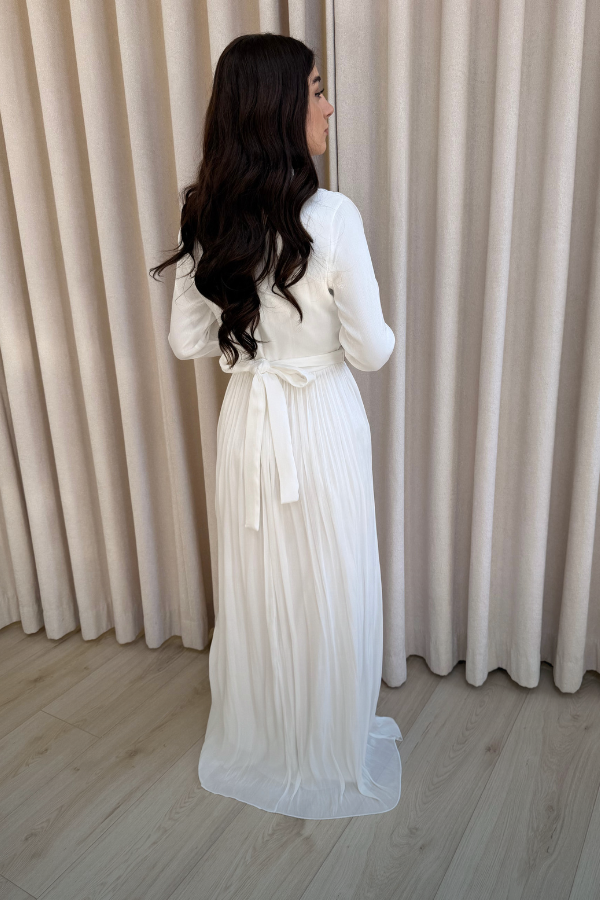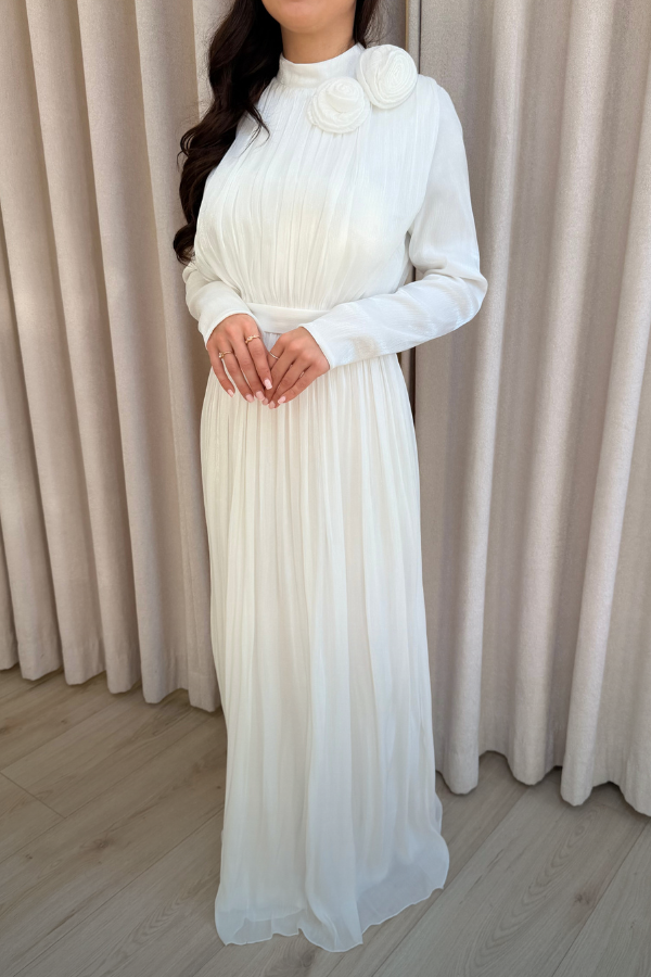 Rosa Dress is een elegante, verfijnde plisséstructuur, lange mouwen en twee subtiele roos-details op de schouder die u naar wens kunt verplaatsen. Tijdloos, chic en perfect voor elke speciale gelegenheid.