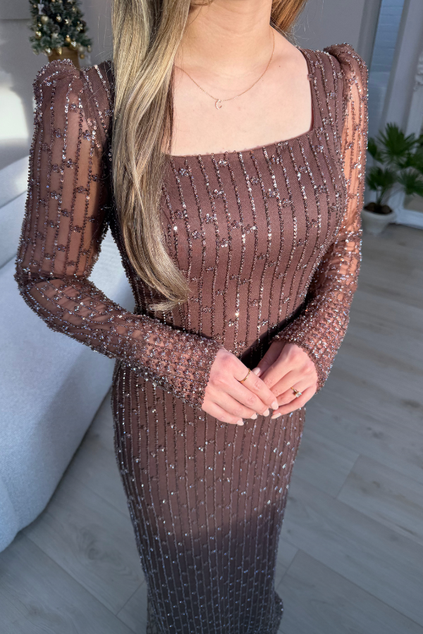 Selin Dress is afgewerkt met subtiele glinsterende details en een rechte halslijn, wat zorgt voor een luxe en vrouwelijke uitstraling. Perfect voor avondgelegenheden, feesten en speciale momenten.